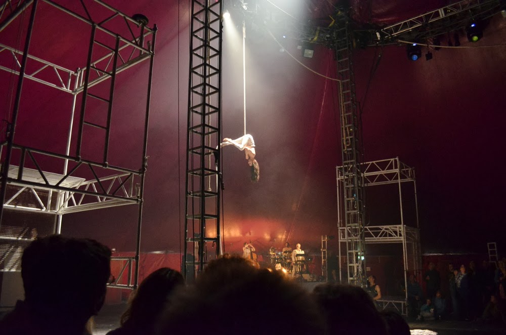 And then we dashed under the setting sun to Brecon where as well as Clive's Mare's Tale at Teatr Brycheiniog, there also happened to be pitched the The NoFit State Circus, who had brought their amazing show Bianco to the middle of Wales, and we would have been mad to miss it.